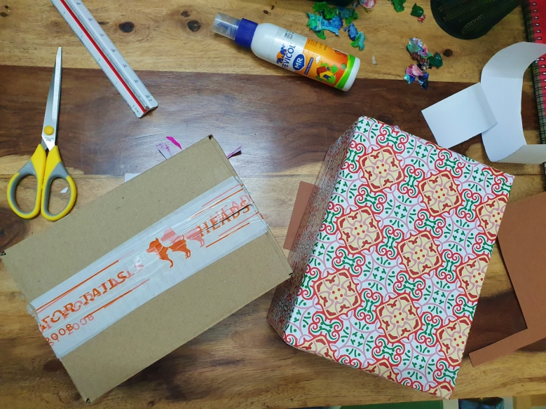 I try to reuse as much as possible at home. I have large diaper boxes from when our son was born. I’ve covered them with colourful wrapping paper and they’re still in use in our wardrobes.