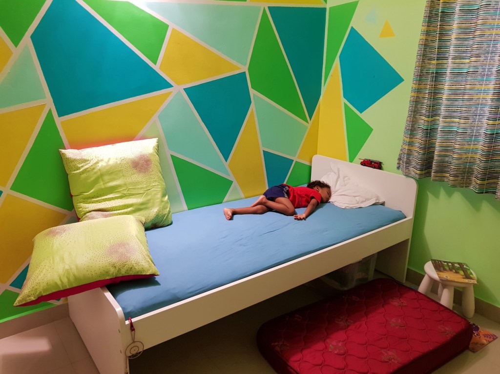 When he transitioned from the crib to a bed, we removed the rocking chair and crib. We also updated one of the walls to make it more vibrant. The low-height wardrobes ensured that he could reach all his toys and books on his own—things we didn’t want him to play with went on top.
