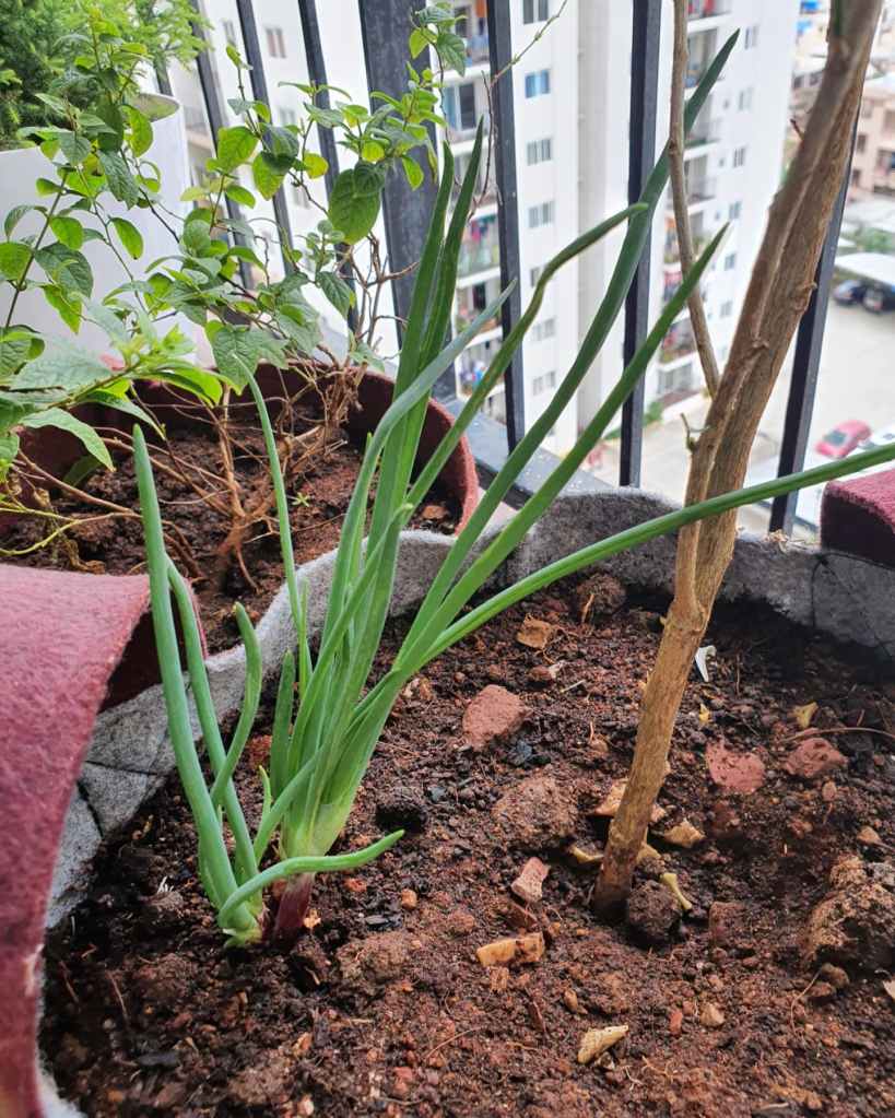 Sprouting potatoes, sweet potatoes, onions can be planted straight away. The potatoes will give you a harvest of potatoes (see here). I had planted sweet potatoes and carrot tops that gave me good looking leaves, but I didn’t get any harvest from them. My onion gave me some green onion to use as a garnish on my food.