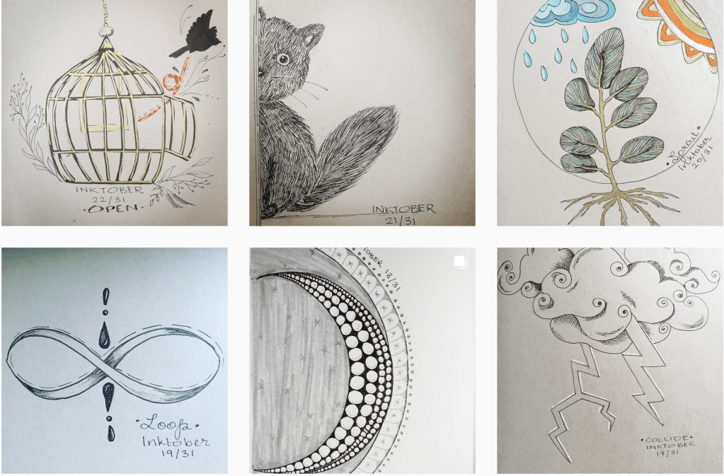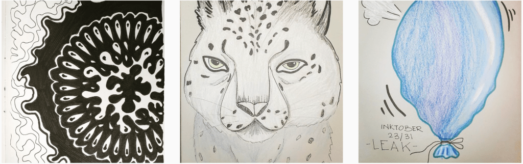 The Inktober prompts are released around September, and artists interpret these prompts throughout October in their own styles. It is fascinating to see so many different interpretations of a single word.